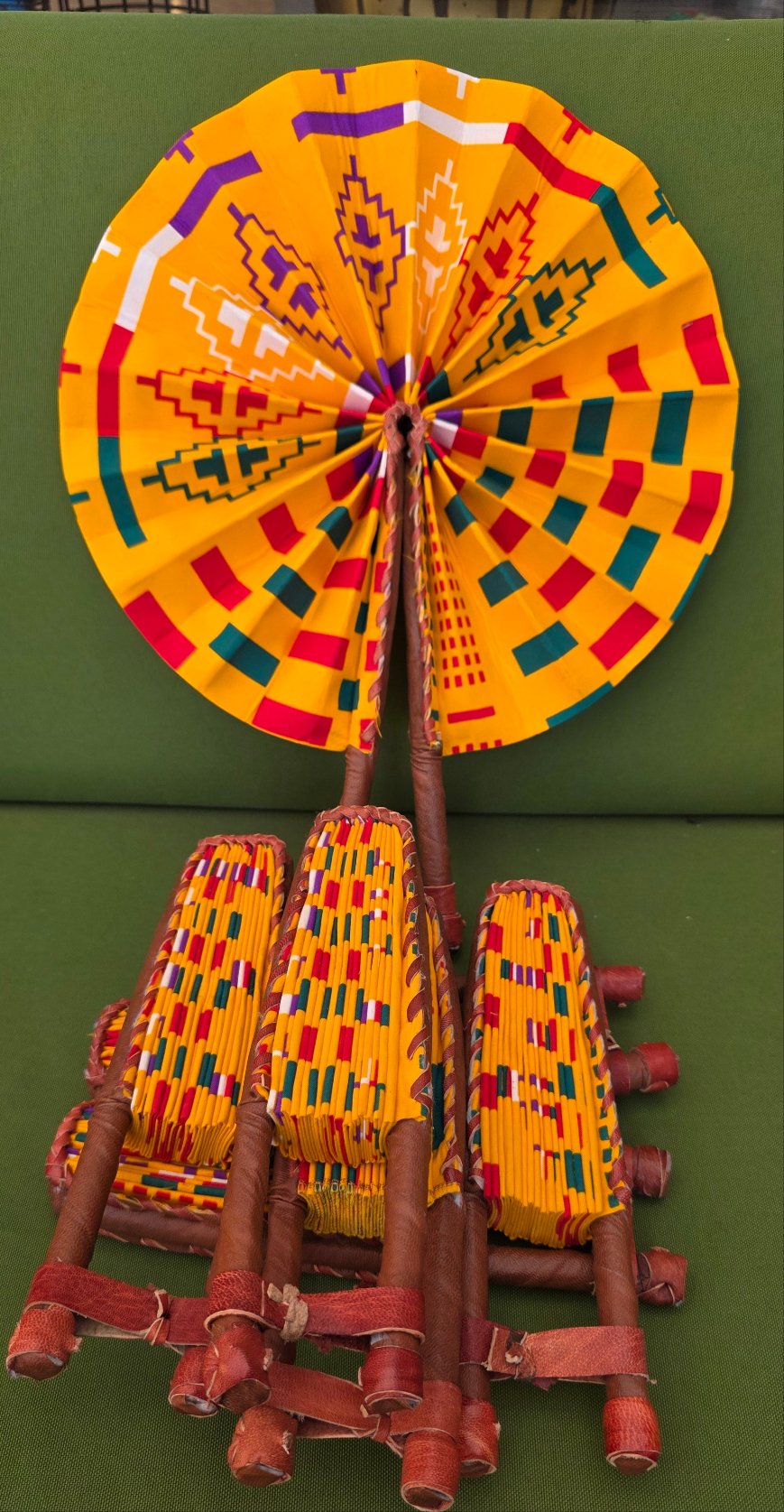 Deze prachtige waaier met een traditioneel Kente-patroon combineert functionaliteit met stijl. De levendige kleuren, waaronder geel, blauw, groen en rood, maken deze waaier een echte blikvanger. Ideaal om jezelf koel te houden op warme dagen of als een decoratief element in je interieur. Het stevige lederen handvat zorgt voor een comfortabele grip, en de waaier is eenvoudig op te vouwen en mee te nemen.