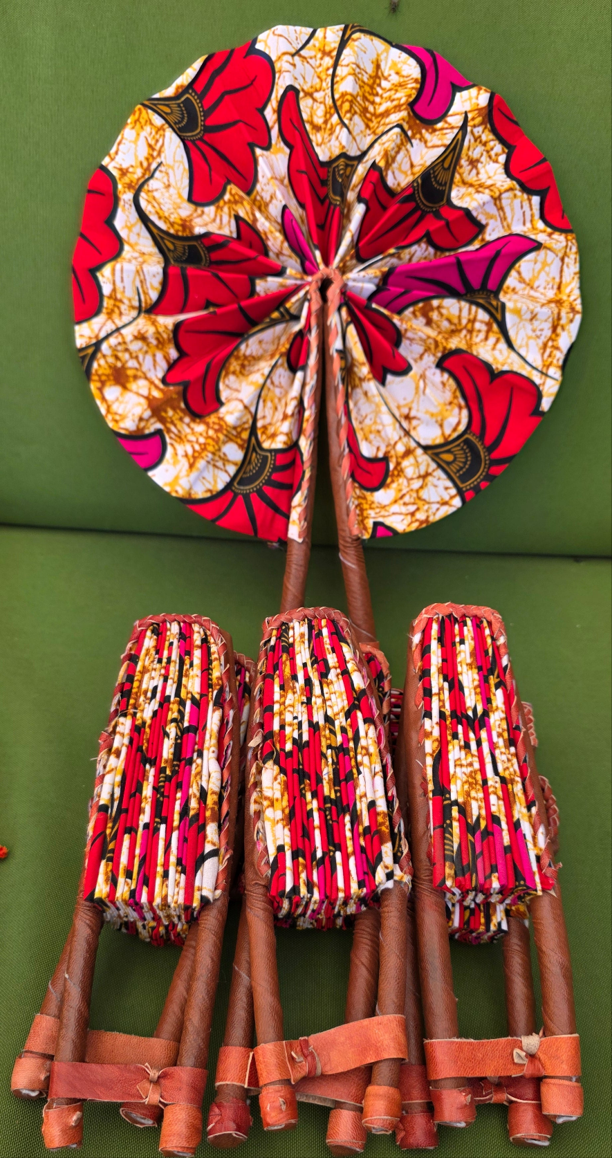 Breng een vleugje Afrikaanse elegantie in je collectie met deze prachtige handgemaakte Kente waaier. Dit unieke accessoire is vervaardigd met authentieke Kente-stof, bekend om zijn levendige kleuren en rijke Ghanese erfgoed. De waaier heeft een stevige leren handgreep en een opvouwbaar ontwerp, waardoor hij gemakkelijk mee te nemen is. Perfect voor warme dagen, culturele evenementen of als decoratief pronkstuk in je interieur.