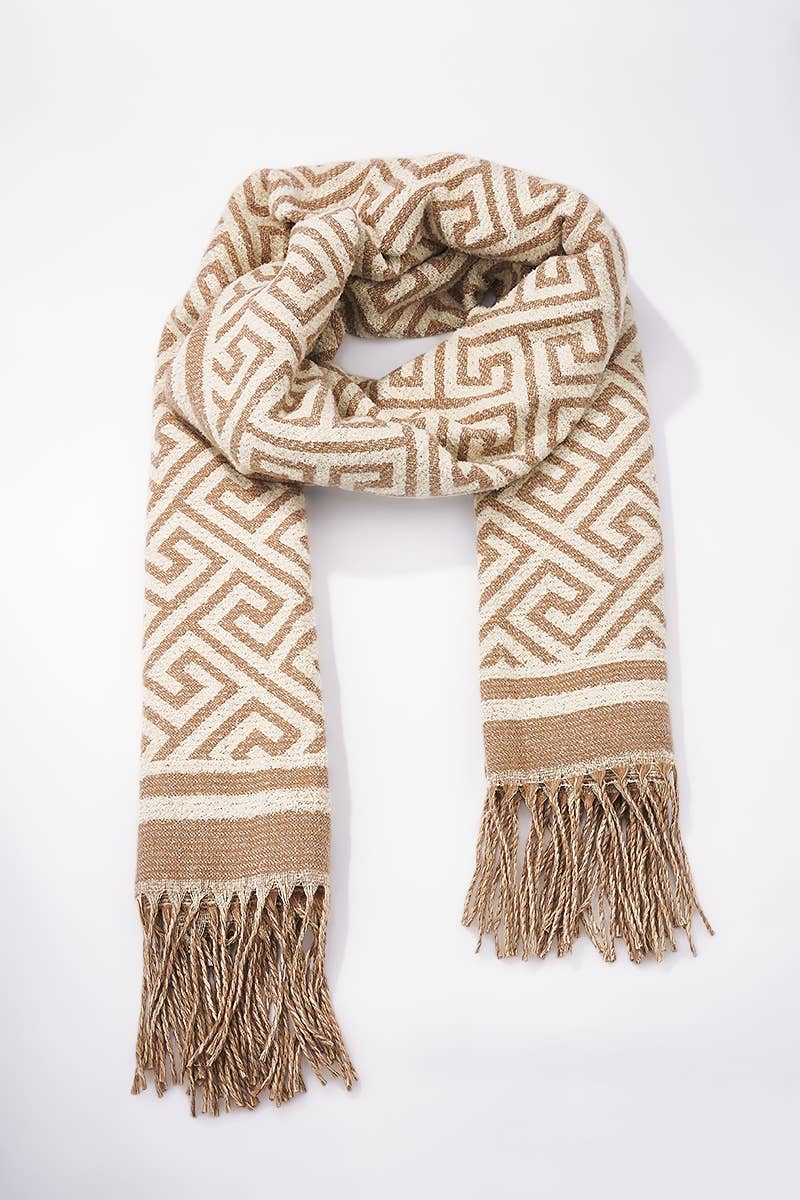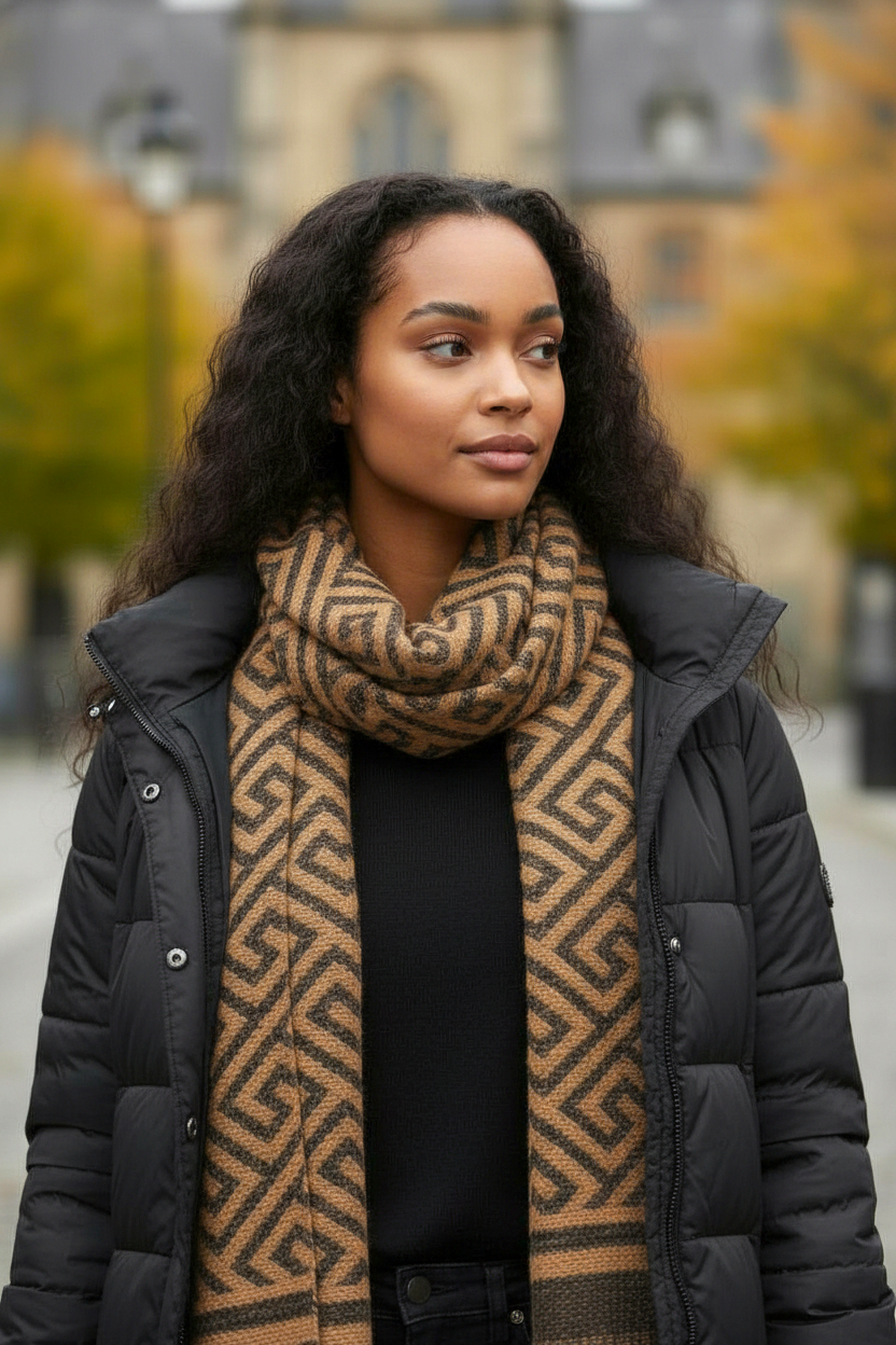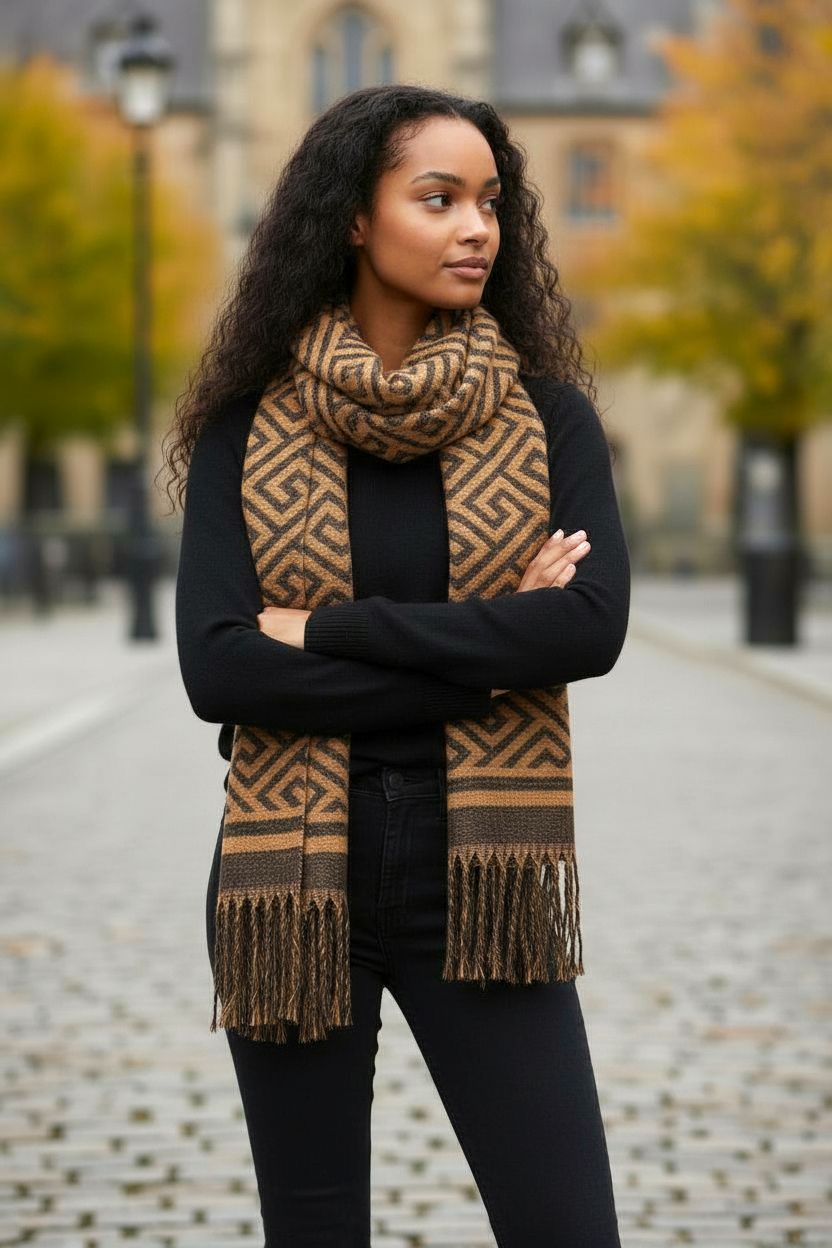 Wollen sjaal met geometrisch patroon – Trendy accessoire ontworpen voor de professionele markt, ideaal om een herfst/wintercollectie compleet te maken met een elegant en veelzijdig stuk. Gemaakt van 30% wol - 70% viscose, biedt dit model een uitstekende balans tussen comfort, duurzaamheid en onderhoudsgemak. Het verfijnde ontwerp zal klanten aanspreken die op zoek zijn naar een chique en tijdloze stijl, geschikt voor verschillende modewerelden.