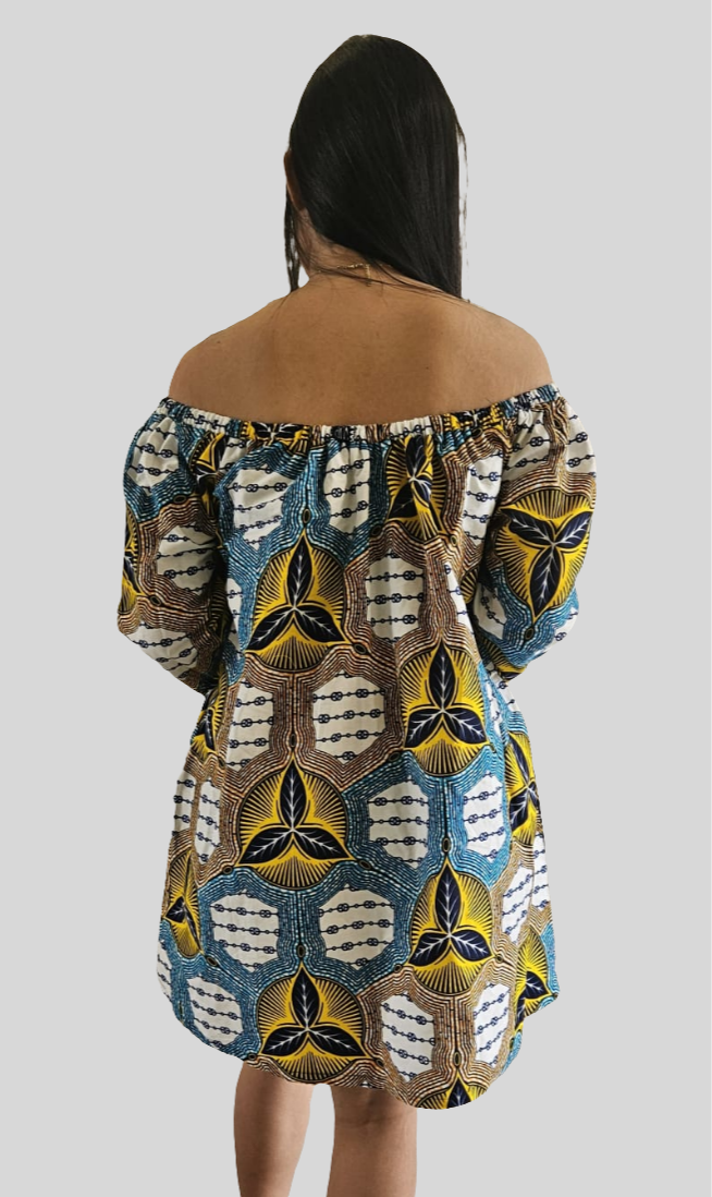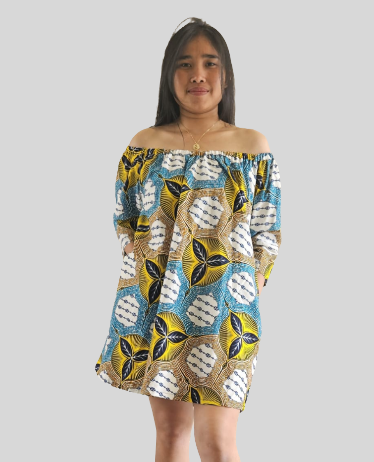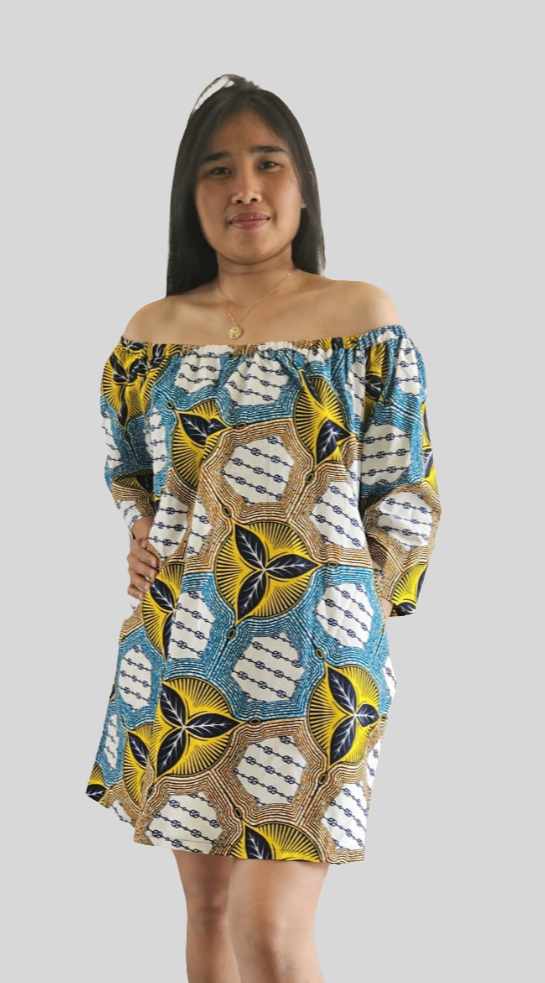 Laat je schouders stralen met deze speelse en elegante off-shoulder jurk, gemaakt van kleurrijke Ankara stof. De jurk heeft een luchtige pasvorm en driekwart mouwen, wat zorgt voor een comfortabele en stijlvolle look. De levendige patronen in geel, blauw en wit maken dit een echte eyecatcher – ideaal voor zonnige dagen, feestjes of een zomerse wandeling.