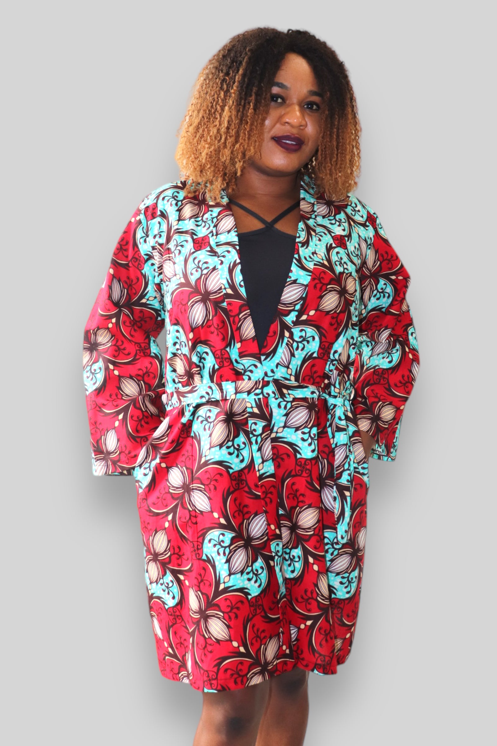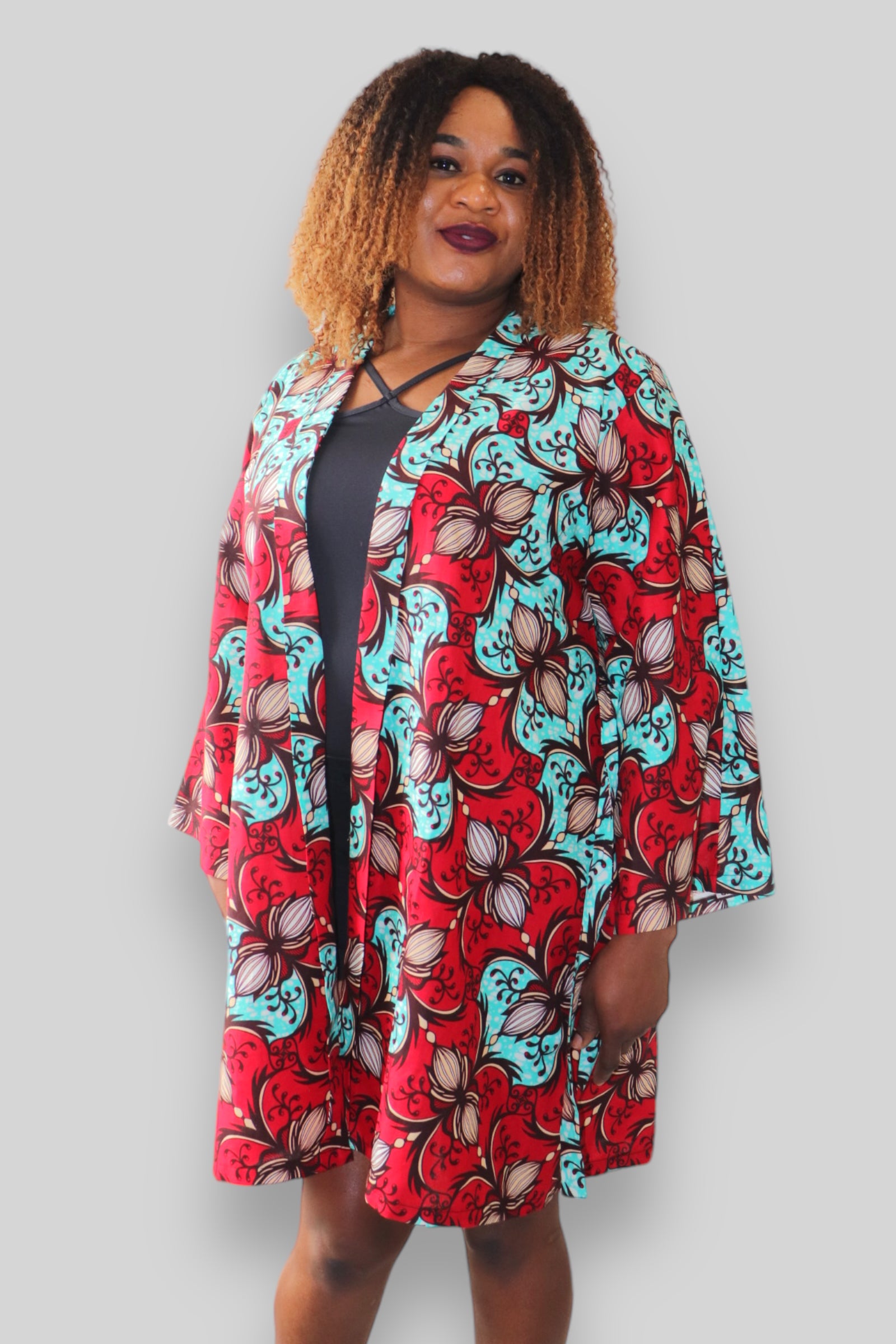 Kimono Vest in Afrikaanse Print - Rood/Licht Blauw