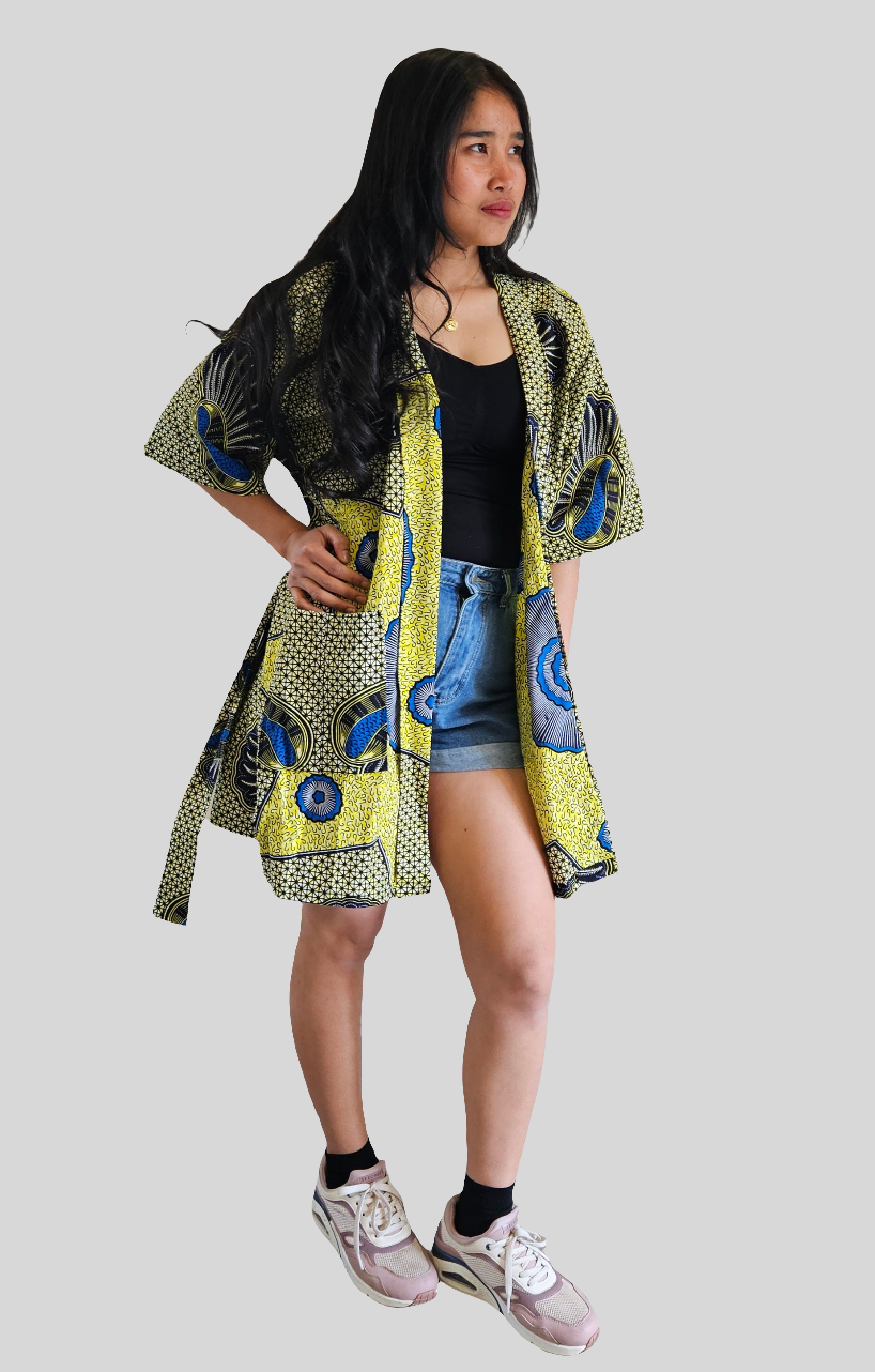 Deze handgemaakte Afrikaanse print kimono op boven knielengte met uitlopende wijde lange mouwen is gemaakt van 100% hoogwaardig wax katoen stof. Ook verkrijgbaar in diverse print
