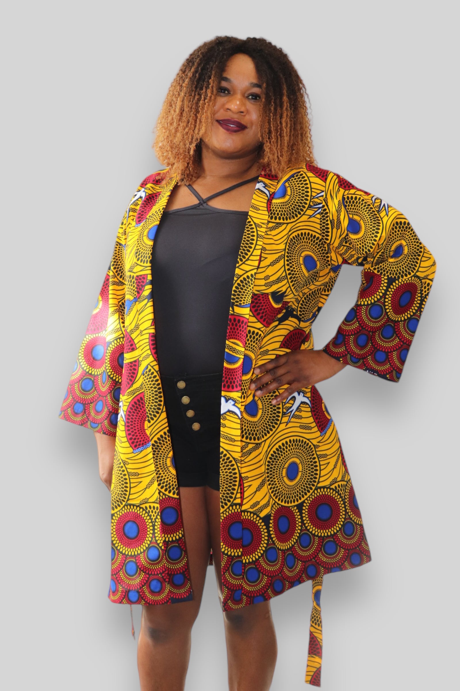 Deze handgemaakte Afrikaanse print kimono op boven knielengte met uitlopende wijde lange mouwen is gemaakt van 100% hoogwaardig wax katoen stof. Ook verkrijgbaar in diverse print