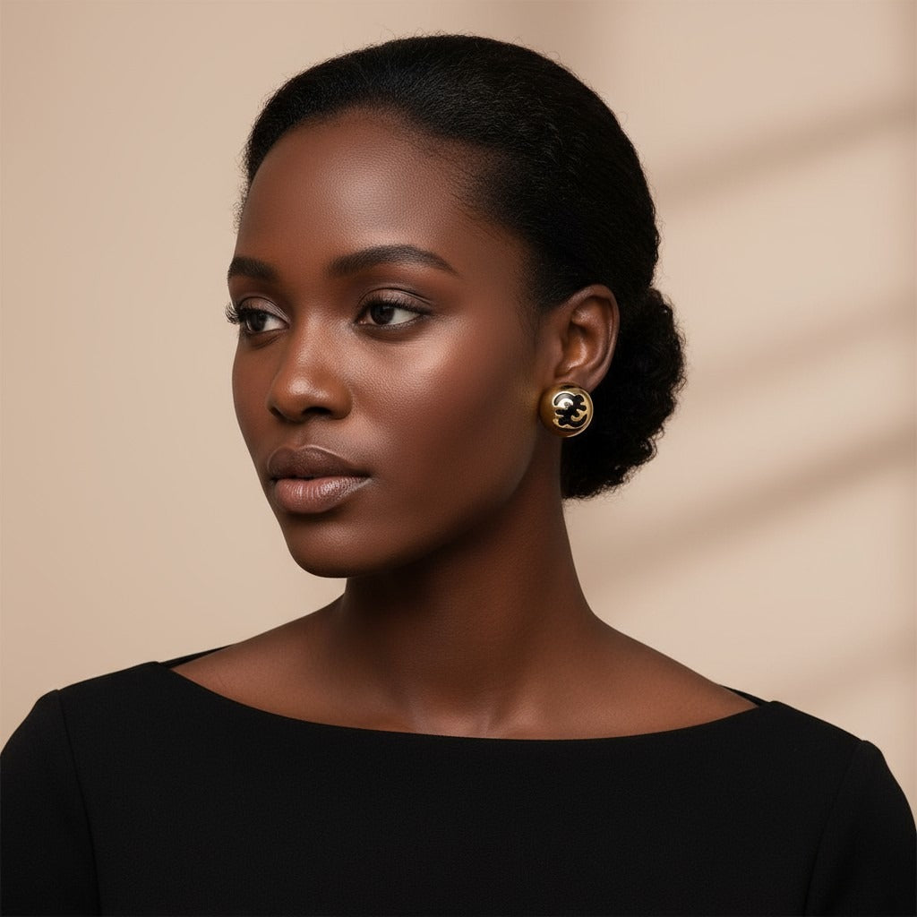 Stijlvolle ronde oorbellen van ca. 2 cm met het Gye Nyame-symbool in zwart op een goudkleurige basis. Licht van gewicht en geschikt voor dagelijks gebruik. Het Gye Nyame-symbool staat voor de almacht van God.