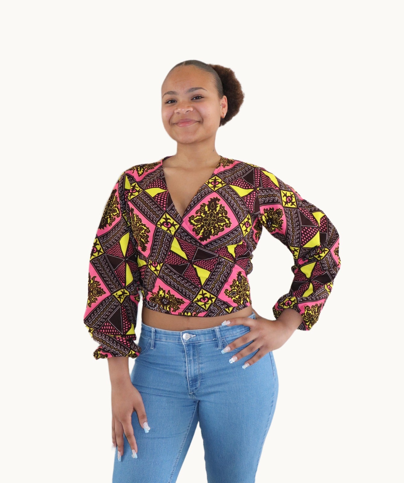 Laat je stijl stralen met deze kleurrijke en vrouwelijke Afrikaanse Wrap top met lange mouwen. Het opvallende patroon in geel, roze en zwart zorgt voor een unieke look die perfect is voor elke gelegenheid – van casual dagen tot zomerse uitjes. Gemaakt van een comfortabele, ademende stof met een flatterende pasvorm en V-hals, accentueert deze top je taille en geeft het je outfit een speelse flair.