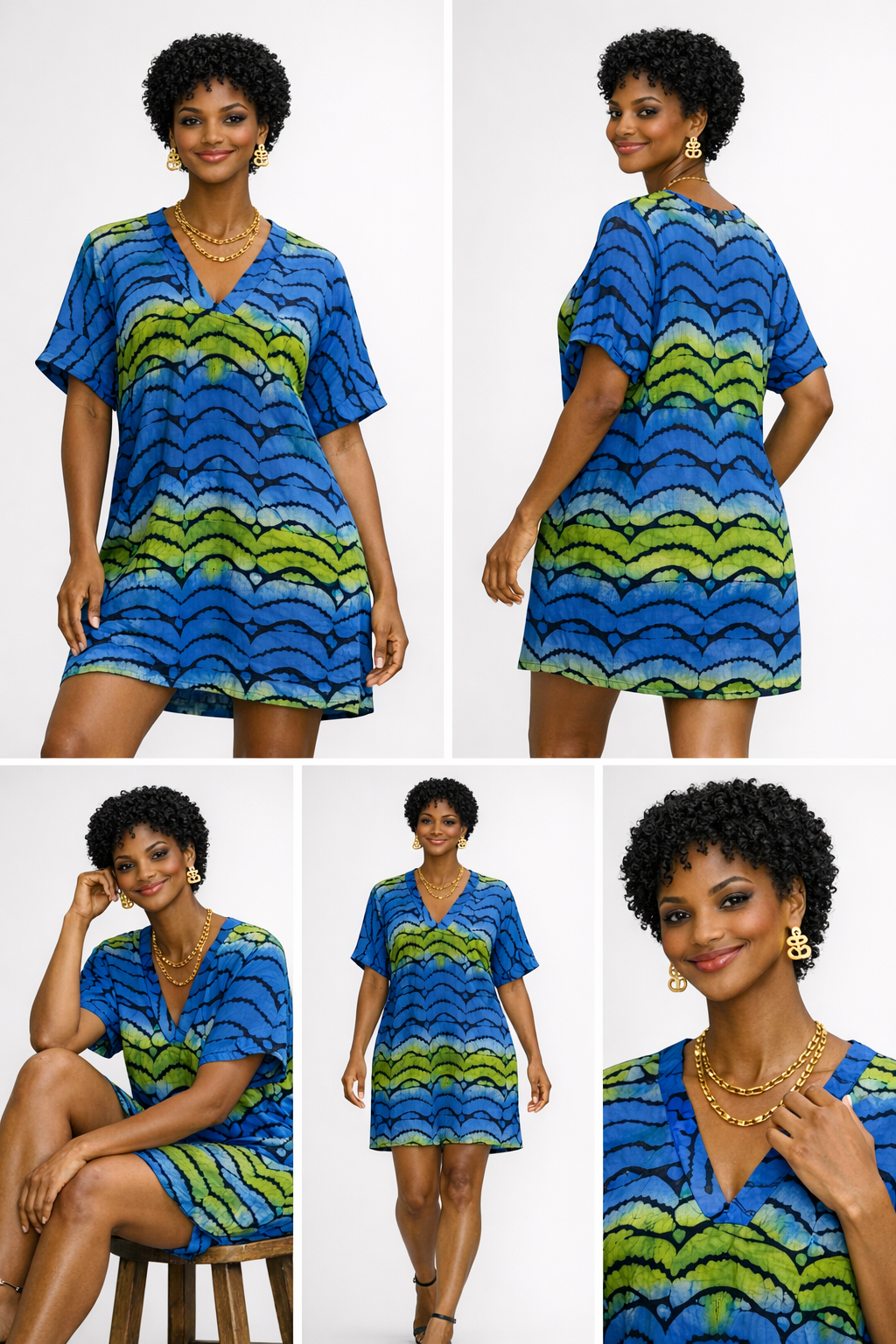 Dit handgemaakte Bubu shirt is gemaakt van authentieke Batik stof van 100% hoogwaardig katoen. Het shirt valt tot boven de knie en heeft een comfortabele, ruime pasvorm die ideaal is voor warme dagen. De blauw‑groene‑print geeft het ontwerp een frisse, moderne uitstraling. Ook verkrijgbaar in diverse prints.