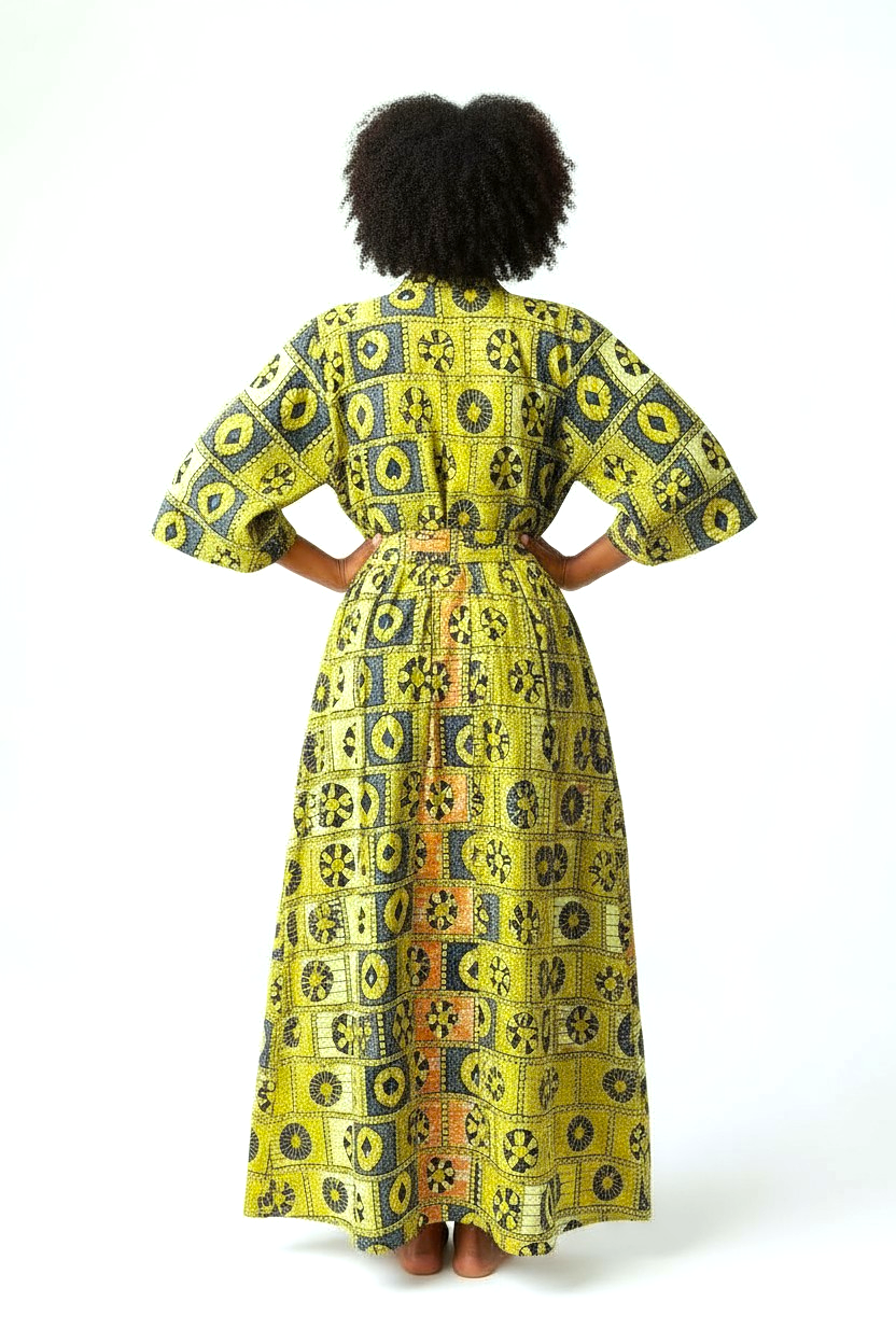 Onze maxi-jurk voor dames met Afrikaanse print in Ankara-stijl is een absolute must-have voor je garderobe. De jurk is gemaakt van een levendige, veelkleurige gele katoenen stof, heeft een V-hals en een hoge split die open of dicht geritseld kan worden.
