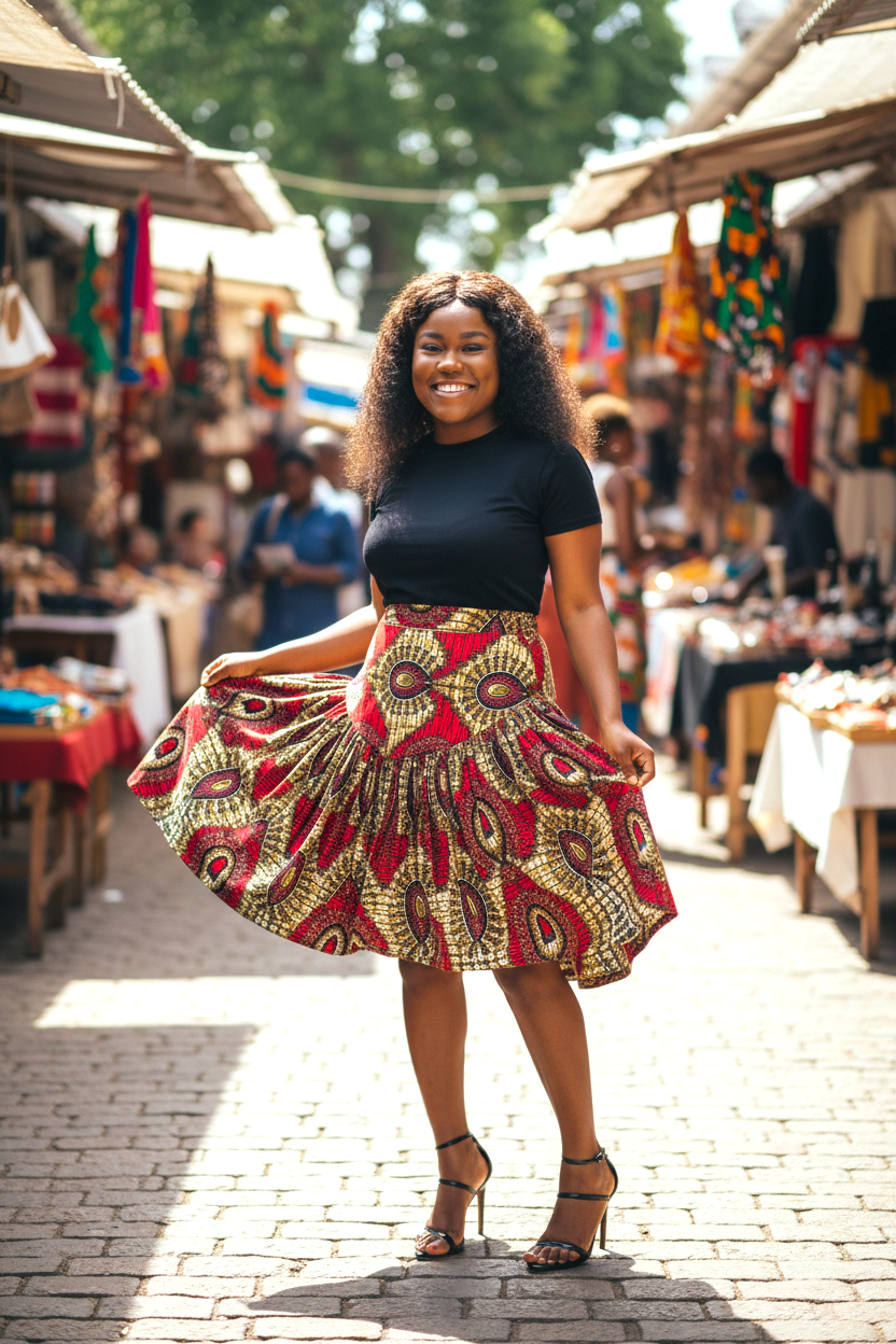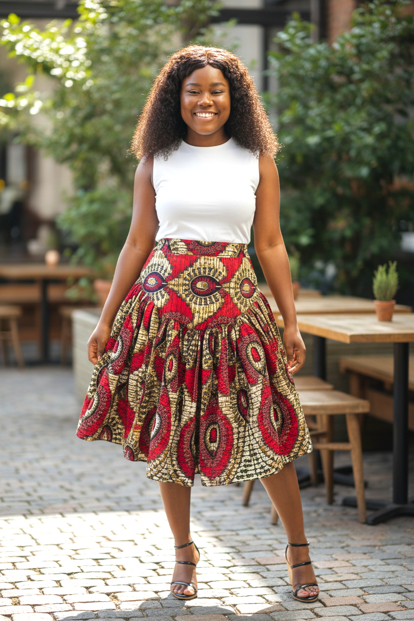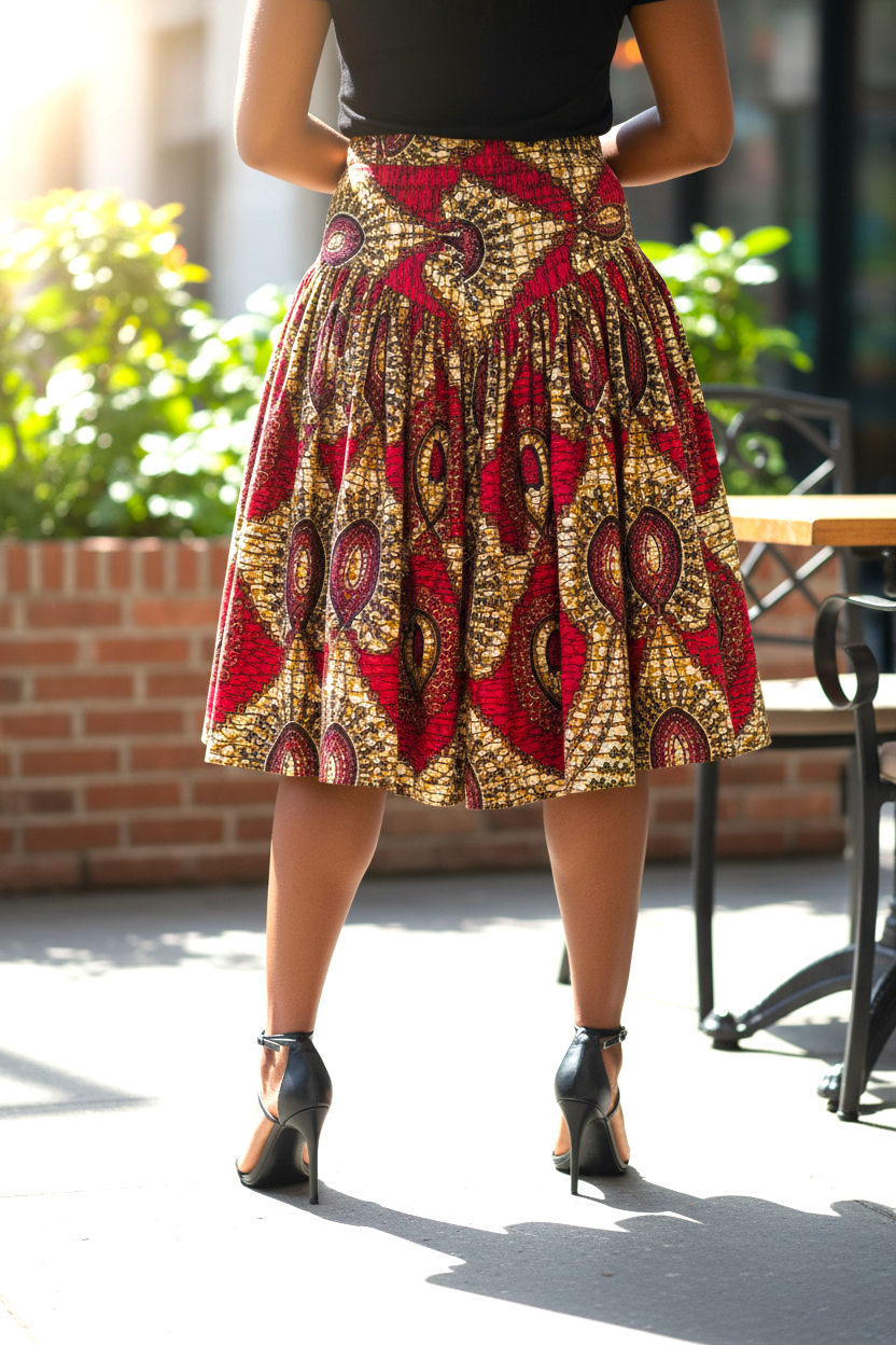 Deze stijlvolle Ankara rok met hoge taille is een echte eyecatcher dankzij het levendige multicolor patroon in rood, geel, groen en zwart. De rok is gemaakt van hoogwaardig waxprint katoen en heeft een wijd uitlopend, mid-length model dat zowel elegant als comfortabel is. Perfect te combineren met een eenvoudige top voor een krachtige, kleurrijke outfit die geschikt is voor dagelijks gebruik, werk en speciale gelegenheden.